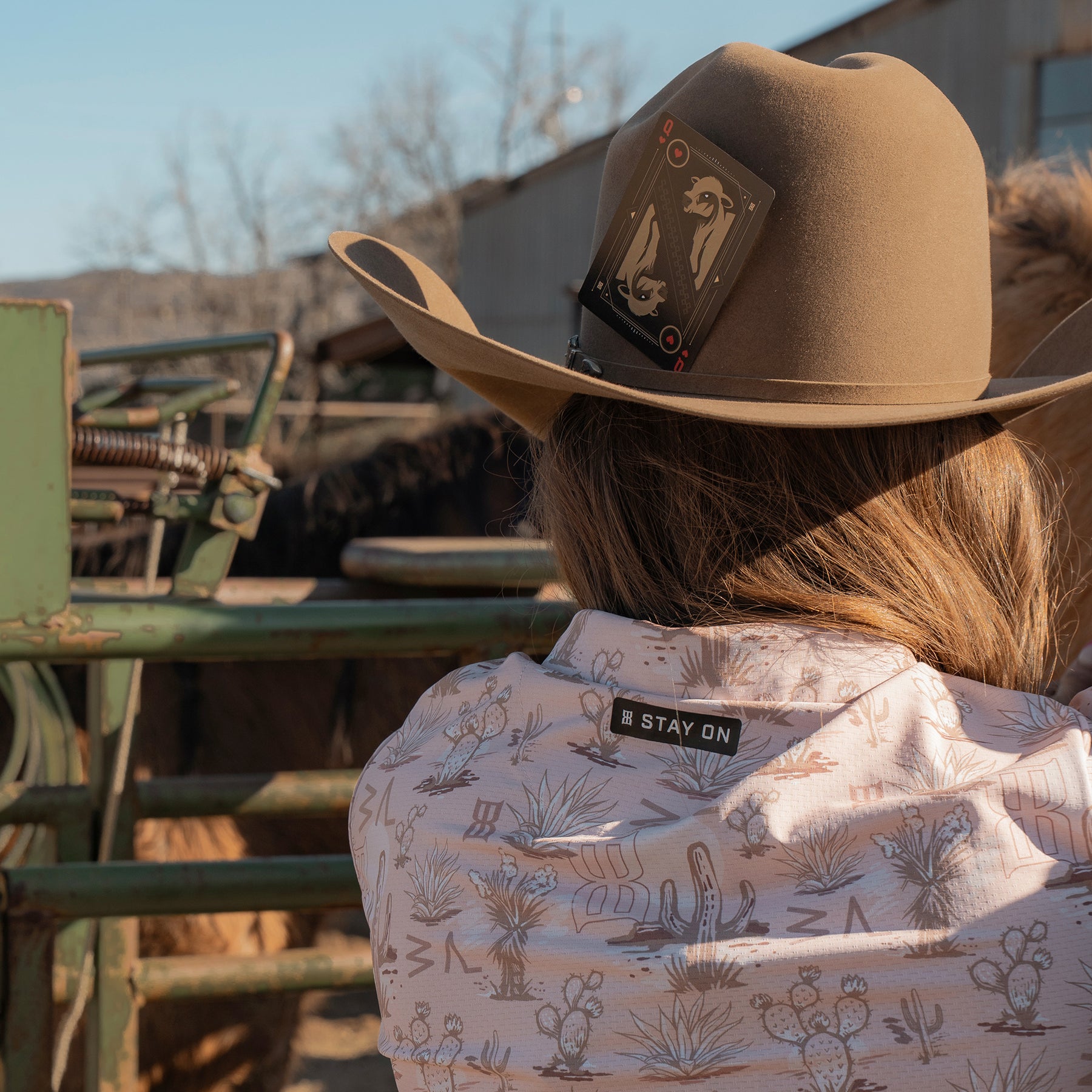 • Layered screen printed “Stay On” patch on back below collar.