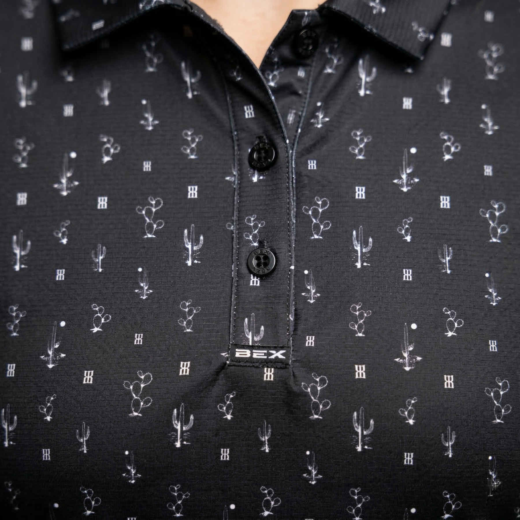 SAGUARO: Una elegante camiseta negra con un estampado de cactus saguaro en blanco y los iconos de BEX®, que combina el carácter del desierto con un estilo depurado, pensada para el campo de golf.